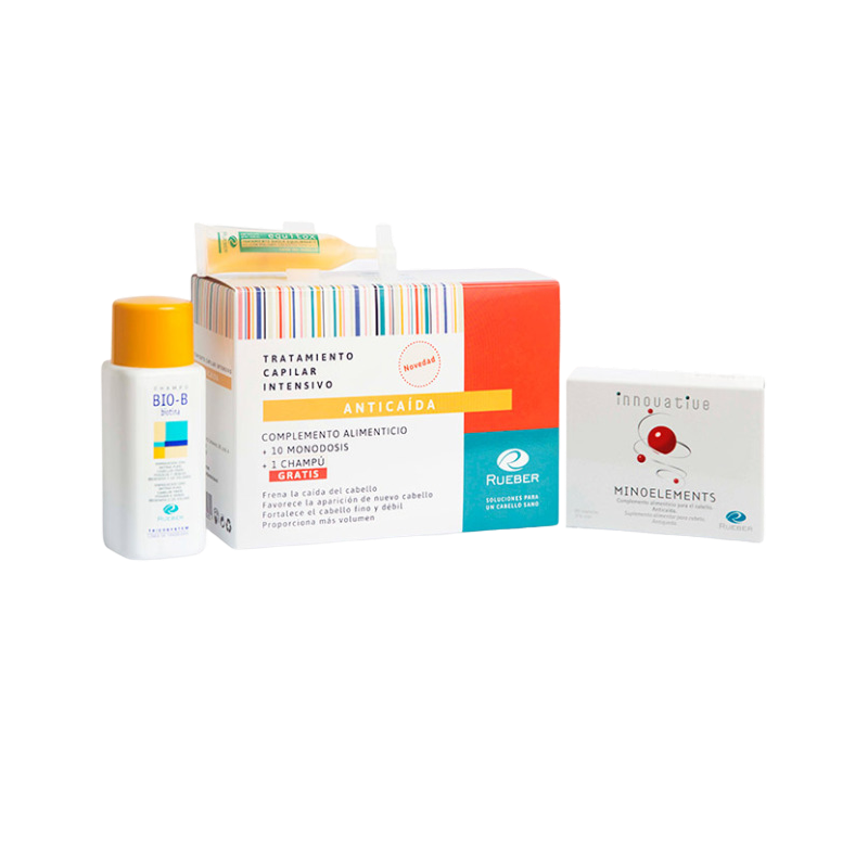 Pack intensivo anticaída que combina champú Bio-B con biotina, tónico Equitox y cápsulas Minoelements para frenar la caída, fortalecer el cabello fino y favorecer el nacimiento de nuevo cabello. Tratamiento 360°: limpieza, hidratación y nutrición interna. Resultados visibles en 4 semanas.Ideal caida y regeneraciones capilares.